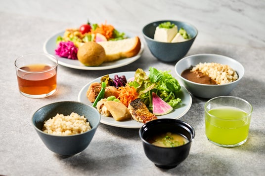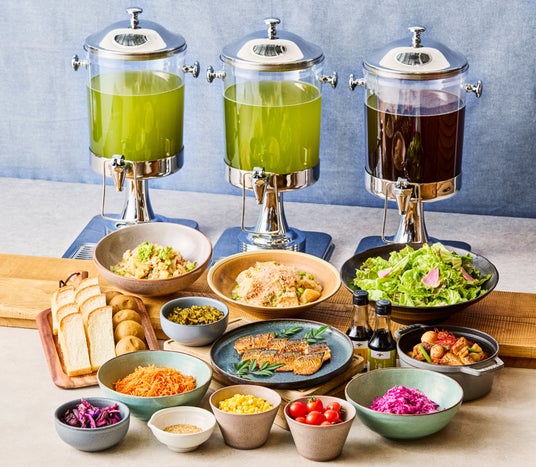 ビュッフェでは、数種類の日本茶を飲み比べながら、旬の野菜を使ったおばんざいや、和惣菜、サラダ、ごはん、味噌汁などをラインナップ。一日の始まりにふさわしい、軽やかで満足感のある朝食をお楽しみいただけます。