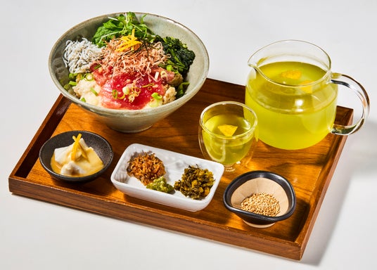 塩麹マグロと釜揚げしらすの柚子茶漬け柚子の香りが広がる煎茶のお茶漬け。