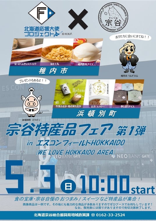 宗谷総合振興局では、北海道日本ハムファイターズの「北海道応援大使プロジェクト」2026年対象地域に宗谷管内が選出されたことを踏まえ、宗谷町村会及び管内10市町村と連携し、エスコンフィールドHOKKAIDO内地域PRブース(WE LOVE HOKKAIDO AREA)を活用した自治体PR及び特産品の販売等を実施することといたしました。
