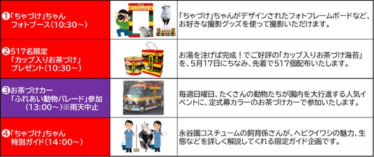 当日は、1.「ちゃづけ」ちゃん展示場付近でのフォトブース設置 2.先着517名様限定「カップ入りお茶づけ」プレゼント 3.園内で行われる動物パレードに定式幕デザインのお茶づけカーで参加4.飼育係による「ちゃづけ」ちゃん特別ガイド を行います。