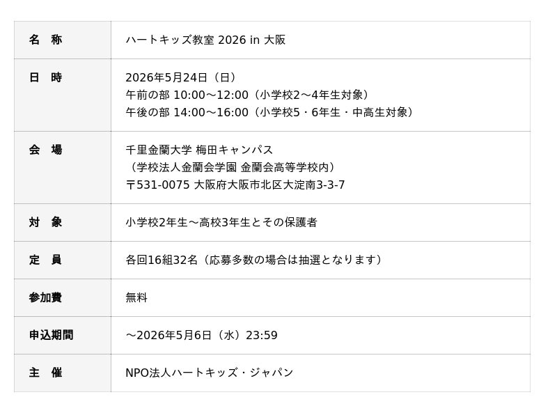 NPO法人ハートキッズ・ジャパン(所在地:千葉県千葉市、代表理事:杉本晃一)は、2026年5月24日(日)に千里金蘭大学 梅田キャンパス(大阪府大阪市北区)にて、子ども向け医療体験ワークショップ「ハートキッズ教室 2026 in 大阪」を開催いたします。