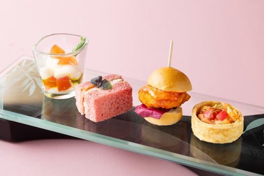 フルーツトマトとパールモッツァレラのカプレーゼや、梅の風味が広がる生ハムとカッテージチーズのサンドウィッチ、オーロラソースのエビカツバーガー、ピリ辛サルサのサーモンタルトレットなど、彩り豊かで夏らしい軽やかな味わいのセイボリーをご用意しました。