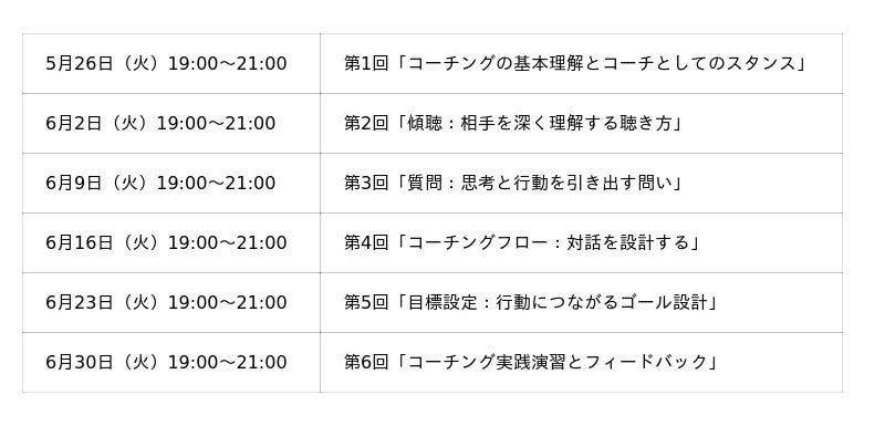 コーチングは、部下やチームのマネジメントに活かせるだけでなく、自己理解が深まる「自己対話スキル」として自身のキャリア設計にも活用できます。本講座では、「対話力」を身につけることに重点を置き、コーチングの概念や目的、全体構造を理解したうえで、信頼関係の築き方や目標設定、質問・傾聴・フィードバックといった具体的なコミュニケーション技術を段階的に習得します。働きながらでも受講がしやすいよう、夜19時からのオンライン(Zoom)開催のため、ご興味のある卒業生の皆様はぜひご参加ください。