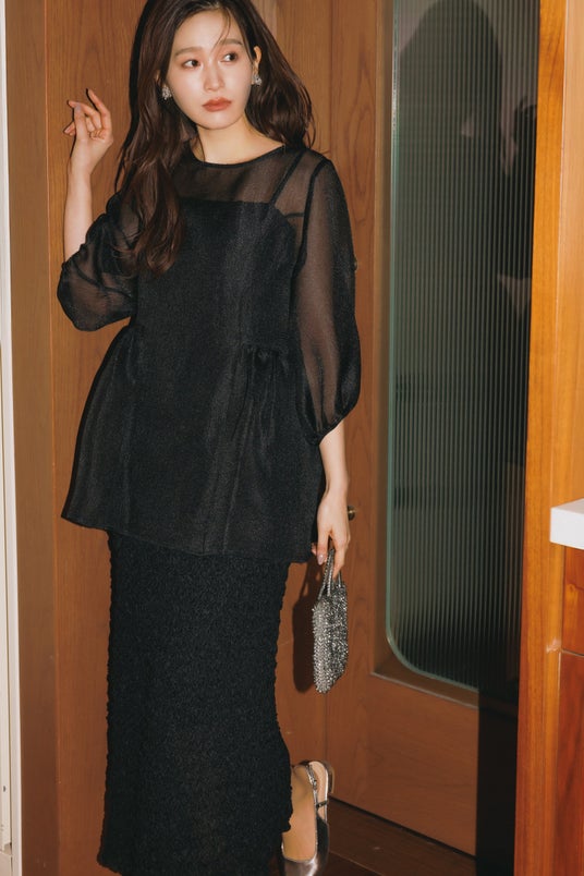 ブラックのオーガンジーのブラウスはシックで華やかな雰囲気を演出し、