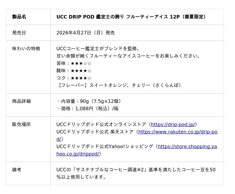 UCC上島珈琲株式会社(本社/兵庫県神戸市、資本金/1億円、社長/芝谷博司、以下UCC)の展開するカプセル式ドリップコーヒーシステム「ドリップポッド」は、アイスコーヒー専用カプセル『UCC DRIP POD 鑑定士の誇り フルーティーアイス』を春夏限定製品として2026年4月27日(月)に新発売します。夏に心地よく寄り添う味わいを目指し、華やかな香りとやさしい甘さの余韻を楽しむアイスコーヒーになるよう設計しました。なお、春夏の期間限定製品としてアイスコーヒー専用カプセルを発売するのはドリップポッドとして初めてです。