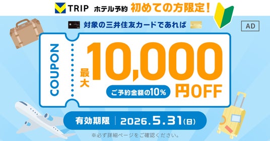 三井住友カード株式会社(本社:東京都江東区、代表取締役 社長執行役員CEO:大西 幸彦 以下:三井住友カード)は、2026年4月27日(月)より、旅行サイト「Vトリップ」で、対象の三井住友カード会員向けに、初めてホテル予約をする方限定で、ホテル予約で利用できる最大10,000円OFF(10%OFF)のクーポンをプレゼントするキャンペーンを開催いたします。この機会にぜひVトリップでオトクに旅行をお楽しみください。