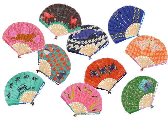 まるくカットを施した扇骨、2色の組み紐チャームなど可愛らしさが詰まったホタテ型扇子。