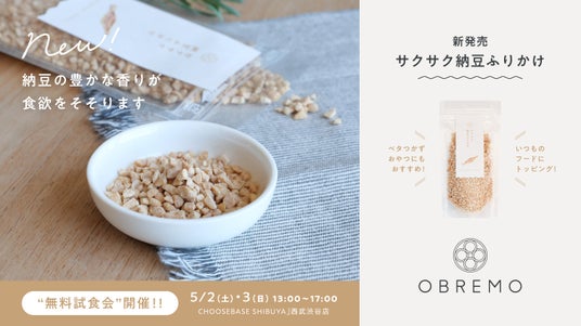 創造性と技術力で多様なITサービスを展開する株式会社エイチームホールディングスのグループ会社である株式会社エイチームコマーステック(本社:愛知県名古屋市、代表取締役社長:望月 一宏)が運営するヒューマングレードドッグフードブランド「OBREMO(オブレモ)」は、2026年4月23日(木)より新商品「サクサク納豆ふりかけ」を、公式オンラインストアにて発売を開始しました。また、2026年4月28日(火)~5月4日(月)の期間限定で、百貨店内の(西武渋谷店)「CHOOSEBASE SHIBUYA」にて本商品の対面販売および試食体験ができるPOPUPイベントを開催いたします。