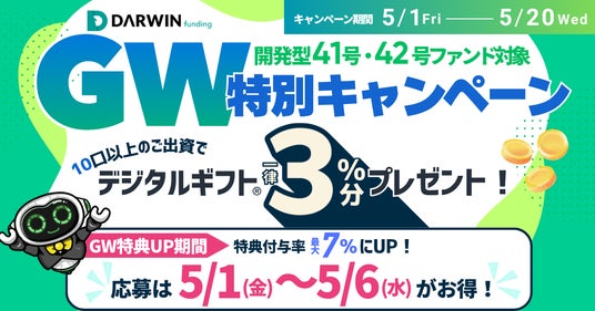 ※本キャンペーンの特典は「DARWIN funding 開発型41号ファンドまたは42号ファンド」への確定された出資額に対して算出されます。