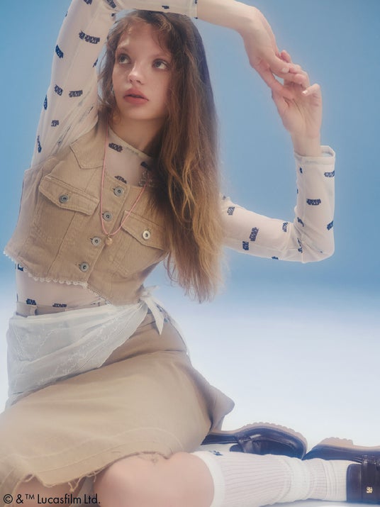 『STAR WARS』のロゴをFURFURらしいカラーリングで総柄プリントし、キャッチーながらもフェミニンな印象に仕上げたシアートップス。