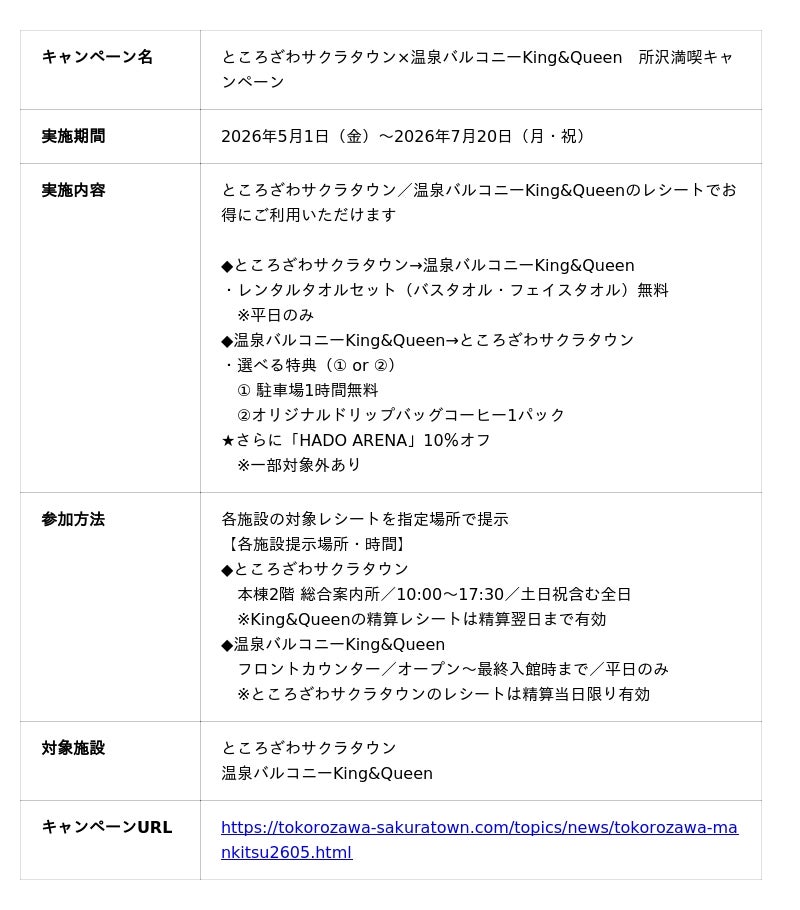 ■「ところざわサクラタウン×温泉バルコニーKing&Queen 所沢満喫キャンペーン」について