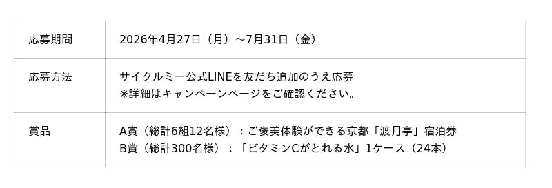 株式会社ドットミーが展開するCycle.me(サイクルミー)は、新商品「ビタミンCがとれる水」の発売を記念して、2026年4月27日(月)よりキャンペーンを開始します。