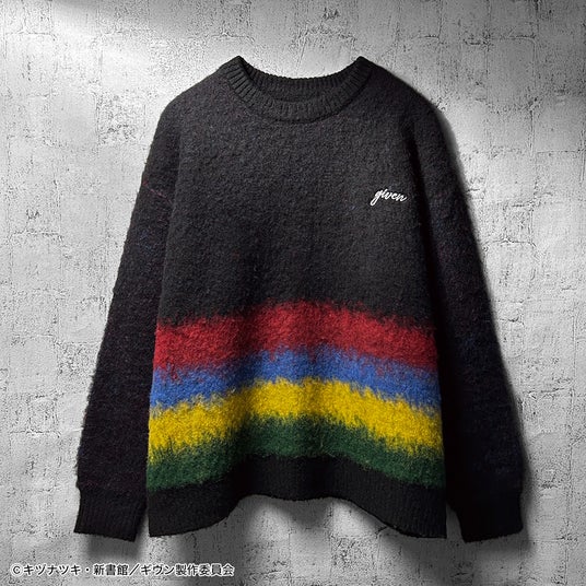 ギヴンメンバーのキャラクターカラーでグラデーションに編み立てたニットプルオーバー。