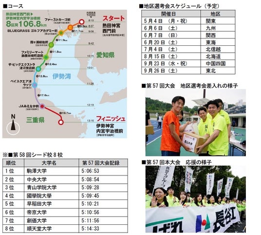 本大会は、「東京箱根間往復大学駅伝競走(箱根駅伝)」、「出雲全日本大学選抜駅伝競走(出雲駅伝)」とともに「学生三大駅伝」のひとつに数えられています。1970年の初開催以来、今年で58回目を迎える伝統ある大会で、全国8地区の代表17校、シード校8校、日本学連選抜、東海学連選抜の合計27チームが出場し、名実ともに真の「大学駅伝日本一」を競います。