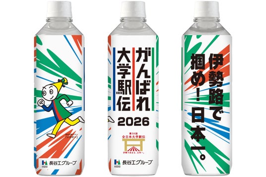 長谷工は、協賛当初より応援テーマを“選手、がんばる!社員、がんばる!みんなでつくる、手づくり駅伝”と掲げています。地区選考会および本大会には、延べ約500名の社員が全国から応援に駆け付け、社員一人ひとりの想いを集結して大会を盛り上げます。また、毎年好評をいただいている駅伝応援ミネラルウォーターは、汎用および地区選考会それぞれのボトルラベルを一新し、長谷工オリジナル駅伝応援マスター「メガポン」を採用しました。また、今年もボトルのミニキーホルダーを作製し、駅伝応援ミネラルウォーターとともに全ての出場チームにお届けします。
