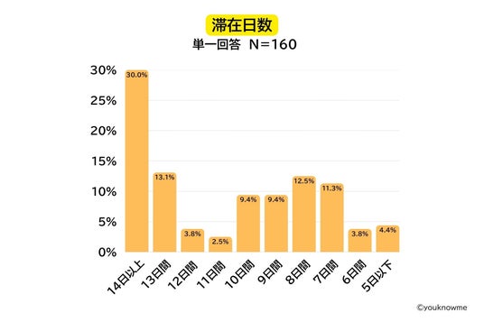 また、滞在日数を聞いてみると「14日以上」が30.0%と最も多く、7日以上の滞在の合計が全体の約9割と、全体的に長期滞在の傾向が強い結果となりました。