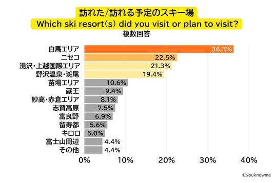 訪問済み、または訪問予定のエリアを尋ねた設問では、「白馬エリア(36.3%)」、「湯沢・上越国際エリア(21.3%)」、「野沢温泉・斑尾(19.4%)」東京からも新幹線でアクセスの良いエリアが上位に入る中、2位には北海道の「ニセコ(22.5%)」がランクイン。