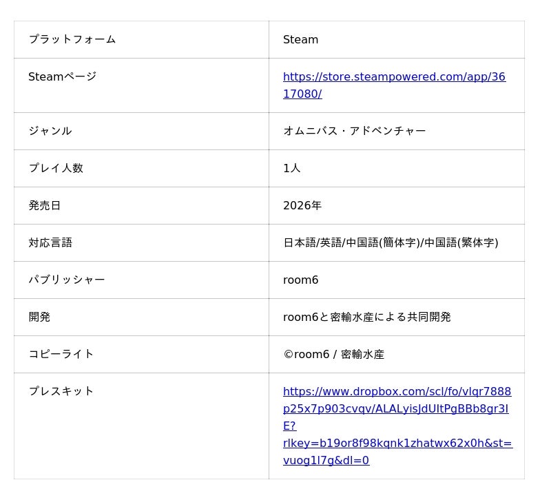 株式会社room6(本社:京都市左京区、代表取締役:木村征史、以下「room6」)および密輸水産は、オムニバス・アドベンチャー『ショートショートフィクションズ』体験版をSteamにて2026年4月27日から配信開始いたしました。