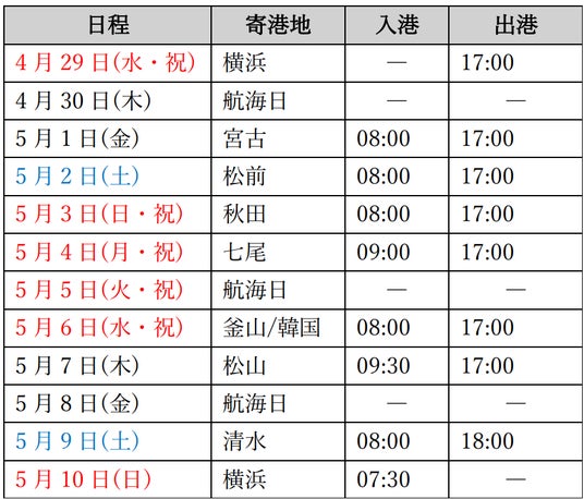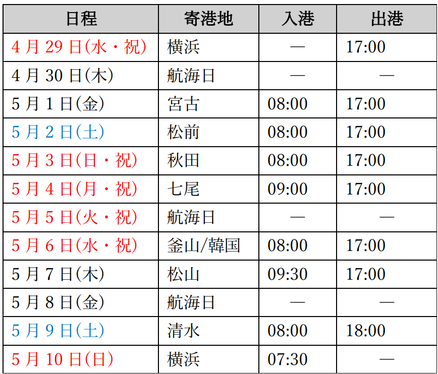 詳細とご予約はこちらから:【公式】MITSUI OCEAN FUJI|横浜発/横浜着|ゴールデンウィーク 日本一周クルーズ