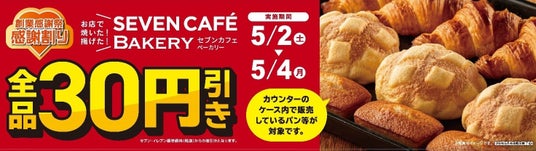 実施予定期間:2026年5月2日(土)~2026年5月4日(月)の3日間限定内容:「セブンカフェ ベーカリー」のお店で焼いた&揚げたシリーズが税抜価格より30円引きとなります。カウンターのケース内で販売されているパン等が対象です。