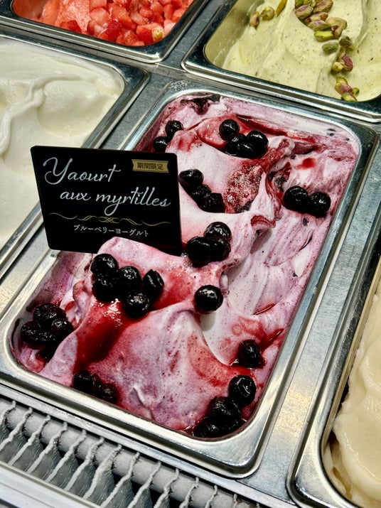 すっきりとした酸味のヨーグルトジェラートに甘く香るブルーベリーのコンフィチュールを混ぜ込んだ
