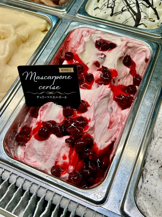 濃厚なマスカルポーネのジェラートに艶やかに香るチェリーのコンフィチュールを混ぜ込みました。