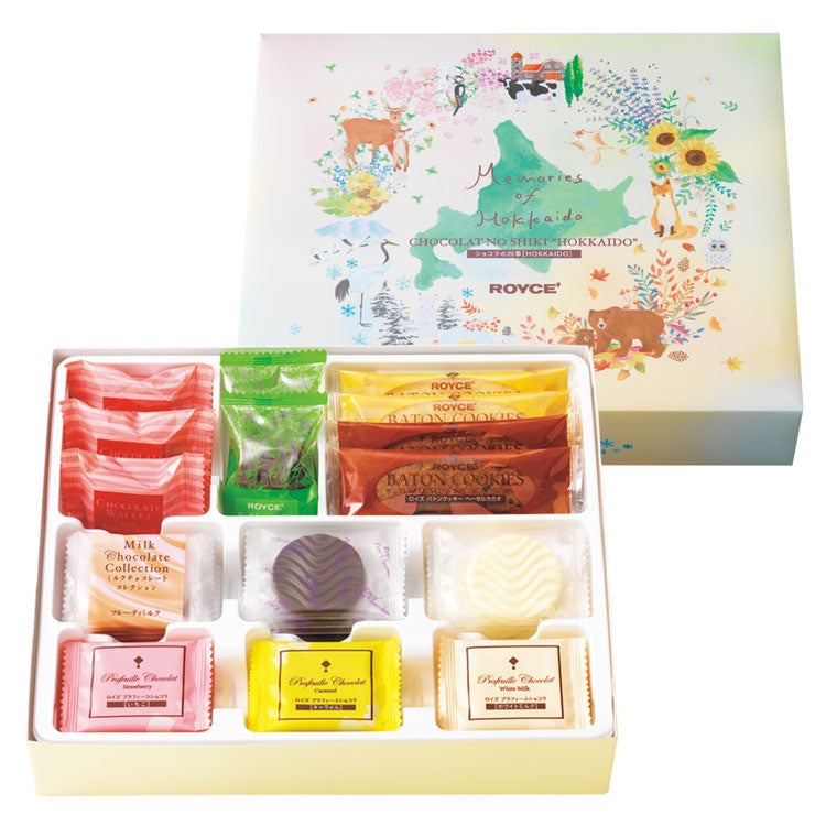 色や素材から、四季それぞれをイメージできるロイズのチョコレートをセレクトした詰め合わせです。パッケージには、北海道の動物や、北海道の四季折々の植物が美しく描かれています。自然豊かな北の大地に想いを馳せながら、ロイズのチョコレートをお楽しみください。