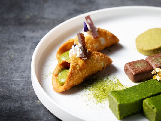 メルキュール横須賀限定 抹茶カンノーロ ~横須賀海軍羊羹を添えて~明治時代より親しまれてきた「横須賀海軍羊羹」を、抹茶とカスタードクリーム入りのカンノーロにトッピング。