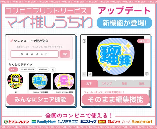 全国の対応コンビニで利用可能なコンビニ推しうちわプリントサービス『マイ推しうちわ』において、作成したうちわデザインを共有できる「シェア機能」をリリースいたしました。