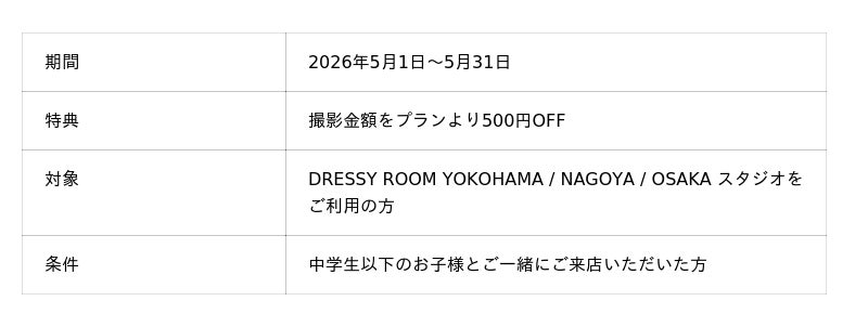 セルフ写真館 PICmiiは、カメラ専門店「カメラのキタムラ」のグループ会社として、撮影画質の仕上がりにこだわったセルフ写真館で、個室での自由な撮影をお楽しみいただけます。DRESSY ROOM YOKOHAMA/NAGOYA/OSAKAスタジオでは、5月限定で『こどもの日フォト割』を実施。5/1~5/31の期間、中学生以下のお子様とご一緒にご来店いただくとご利用料金より500円OFFとさせていただきます。(記事を見た旨をお伝え下さい。)