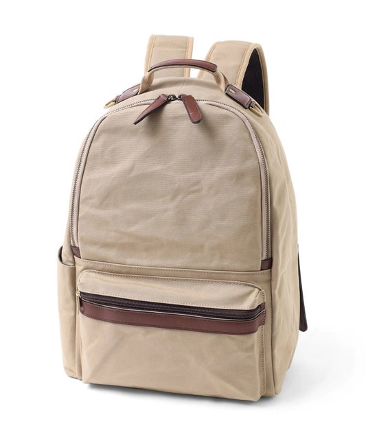 生地にロウを染み込ませ、防水性と独特の風合いを持たせるパラフィン加工を施した帆布リュック。