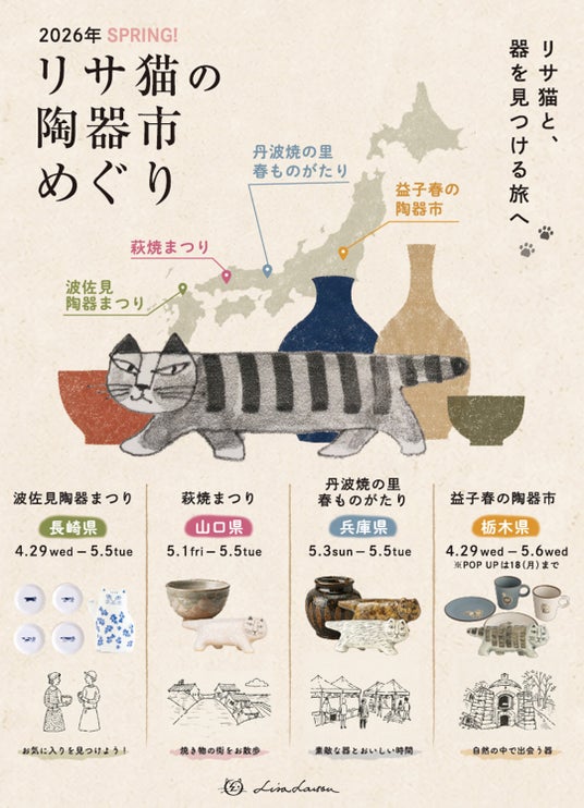 2026年のゴールデンウィーク、リサ・ラーソンのにっぽんのリサ猫が全国4ヶ所の陶器市を巡ります!益子・波佐見・丹波・萩、それぞれの産地の土と歴史が息づく会場で、リサ・ラーソンの世界をお楽しみください。