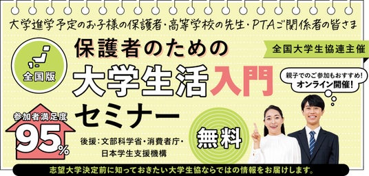開催 7/26(日)オンライン開催 参加無料 お子様の大学受験や進路決定の前に知っておきたい情報をおつたえします! 主催:全国大学生協連/後援:文部科学省・消費者庁・日本学生支援機構
