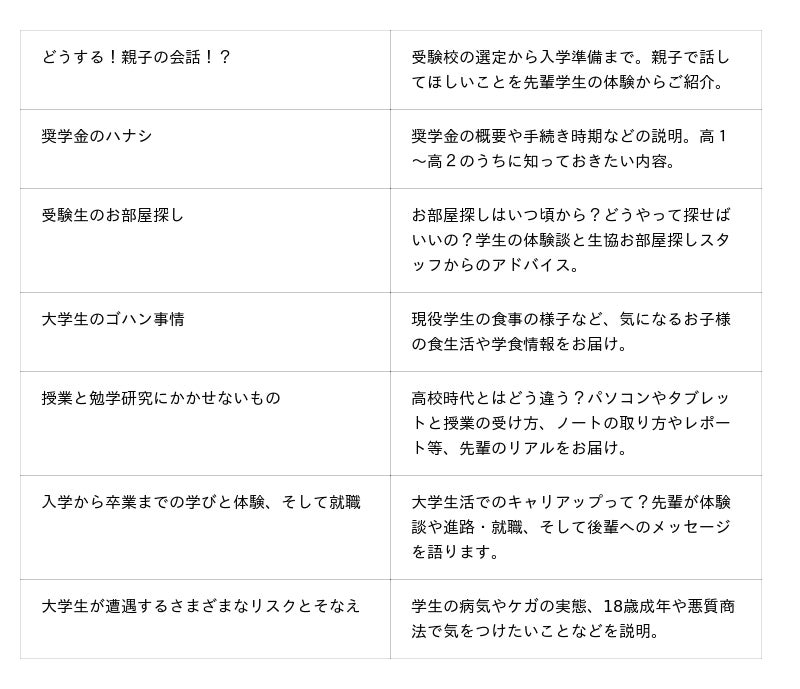 この企画は全国大学生活協同組合連合会がおこなった調査結果(「保護者に聞く新入生調査」の最新データ)をもとに受験・入学準備から大学生活にかかるお金の話を説明します。また、全国の大学生をもつ保護者の方や学生にインタビューをおこない、さまざまなアドバイスをお伝えします。