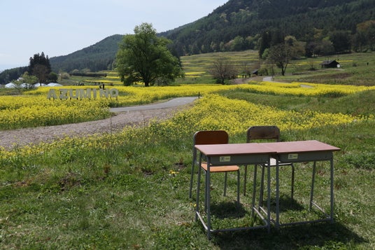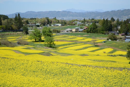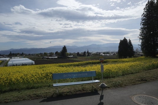 里山文化ゾーンのナノハナ畑も見ごろとなっています。視界いっぱいに広がる6ha、500万本の広大なナノハナ畑は5月上旬ごろまでお楽しみいただけます。ナノハナとの撮影を楽しめるベンチやバス停などのフォトスポットも設置しております。