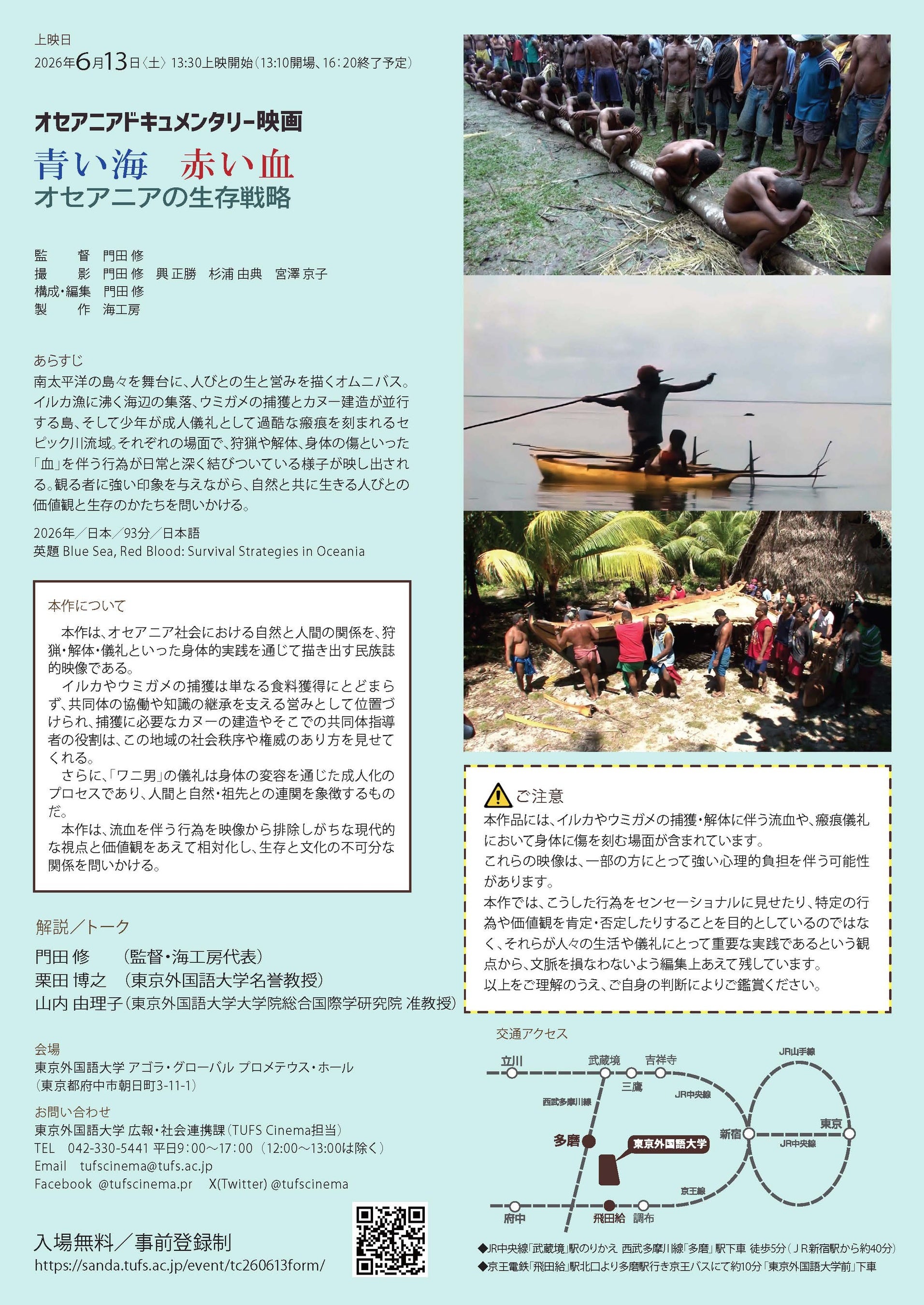 東京外国語大学(東京都府中市、学長:春名展生)は、2026年6月13日(土)、TUFS Cinemaにおいて映画『青い海・赤い血:オセアニアの生存戦略』の上映会を開催いたします。