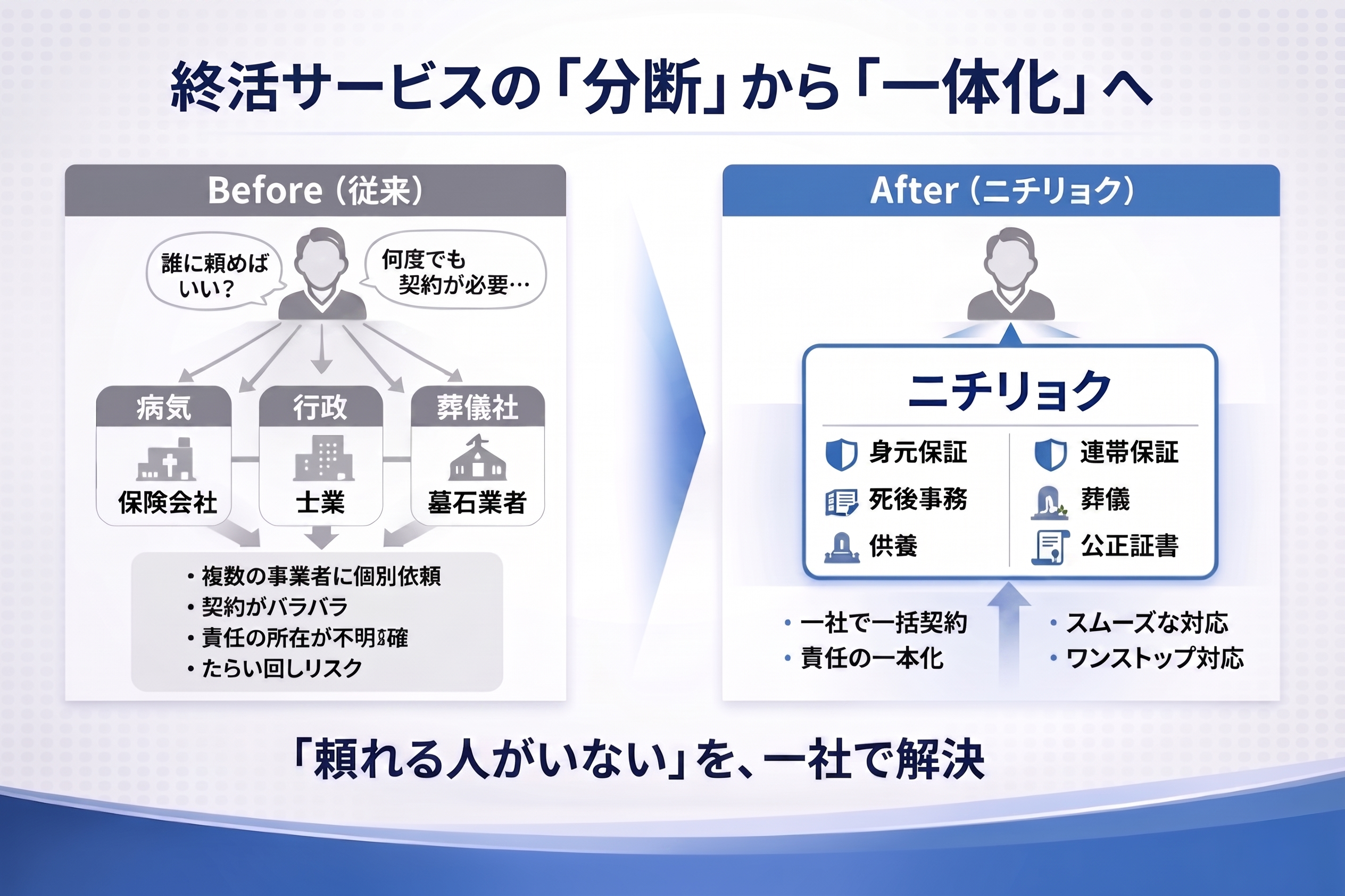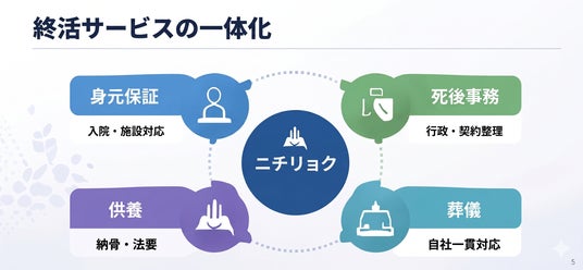 株式会社ニチリョク(本社:東京都中央区八重洲1-7-20、代表取締役:渡邊 将志、以下「当社」)は、“おひとりさまシニア”の増加に伴う「身寄りがないことによる不安」という社会課題に対応するため、身元保証・死後事務委任・葬儀・供養を一体で提供する終活サービスを2026年5月1日より開始いたします。