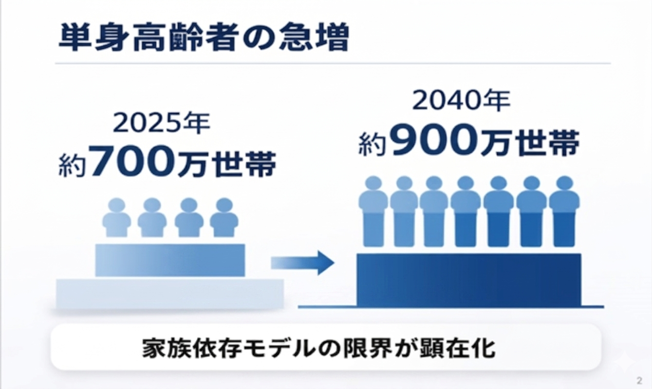 こうした問題は、従来の「家族が支える前提」の仕組みでは対応が困難になっています。65歳以上の単身世帯は今後、拡大すると見込まれており、今後20年以上にわたり確実に成長する社会課題市場です。