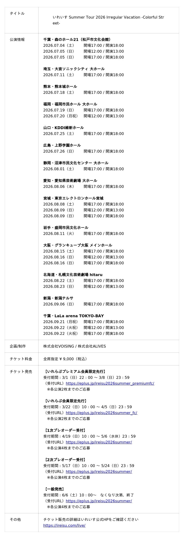 株式会社VOISING(本社:東京都港区、代表者:ないこ、以下、VOISING)所属の2.5次元アイドルグループ「いれいす」は、全国13都市14会場を巡るツアー『いれいす Summer Tour 2026 「Colorful Street」』の開催を記念し、2025年夏ツアーのファイナル「Kアリーナ横浜」公演のダイジェスト映像を公式YouTubeチャンネルにて公開いたしました。