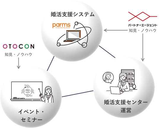 当社は官民一体となって、地方創生や少子化対策を行うことが持続可能な社会の実現につながると考え、当社結婚相談所が有する知見やノウハウを可能な限り、地方の活性化のために生かしていただければと考えております。このため、当社結婚相談所を支える独自開発のマッチングシステムと同等程度の機能を有する「parms」を多くの地方自治体に提供させていただいております。また、これに加えて近年では、婚活支援センターの運営や各種イベント・セミナーの受託も行っております(地方自治体向け3Dオペレーション)。なお、京都府においては、2017年度に「parms」を導入し、2022年度にAIを搭載した新バージョンの「parms」を再提供しており、2022年度より5年連続で婚活支援センターの運営を受託するに至っております。