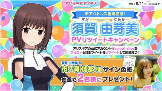 株式会社コロプラ(代表取締役社長 上席執行役員 CEO:宮本貴志、本社:東京都港区、以下「コロプラ」)は、スマートフォン向けゲーム、武装カスタマイズアクション『アリス・ギア・アイギス(以下、アリスギア)』にて、4月27日(月)より免許とりたて新米アクトレス「須賀 由芽美(CV:市ノ瀬 加那)」がプレイアブルキャラクターとして登場したことをお知らせします。