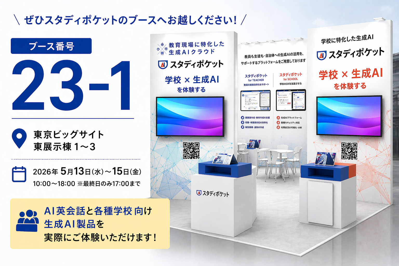 当社ブース(小間番号:23-1)では、現在開発中の最先端AI英会話製品および、全国の学校現場で利用が拡大している生成AIプラットフォーム「スタディポケット」を実際にご体験いただけます。