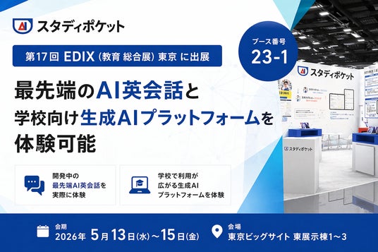 スタディポケット株式会社(本社:東京都千代田区、代表取締役:山地瞭/鶴田浩之、以下「スタディポケット」)は、2026年5月13日(水)から5月15日(金)に東京ビッグサイトにて開催される教育分野最大級の展示会「第17回 EDIX(教育 総合展)東京」に出展いたします。