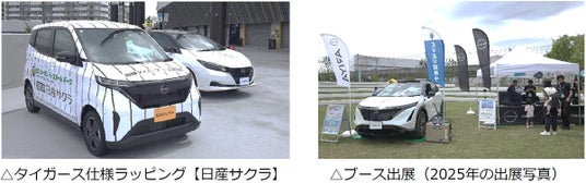 兵庫日産自動車から、タイガース仕様に特別ラッピングされた【日産サクラ】や新型【日産リーフ】【日産アリア】などのEV展示を実施!兵庫日産ブースでは電気自動車から給電された電気を使用したエアー抽選器による抽選会を行います!さらにほかの一部ブースでも、日産自動車のEVから給電された電力を使用して運営します。