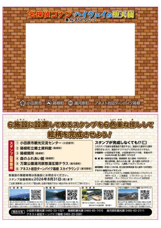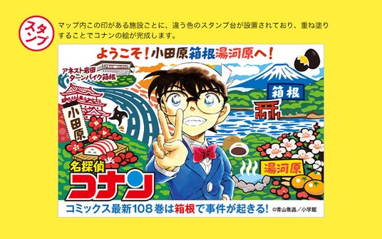 【内容】本市、箱根町、湯河原町の計6施設に設置してあるスタンプ6色を1枚のスタンプ台紙に重ねることで「名探偵コナン」と地域の魅力が描かれた1枚のイラストが完成します。