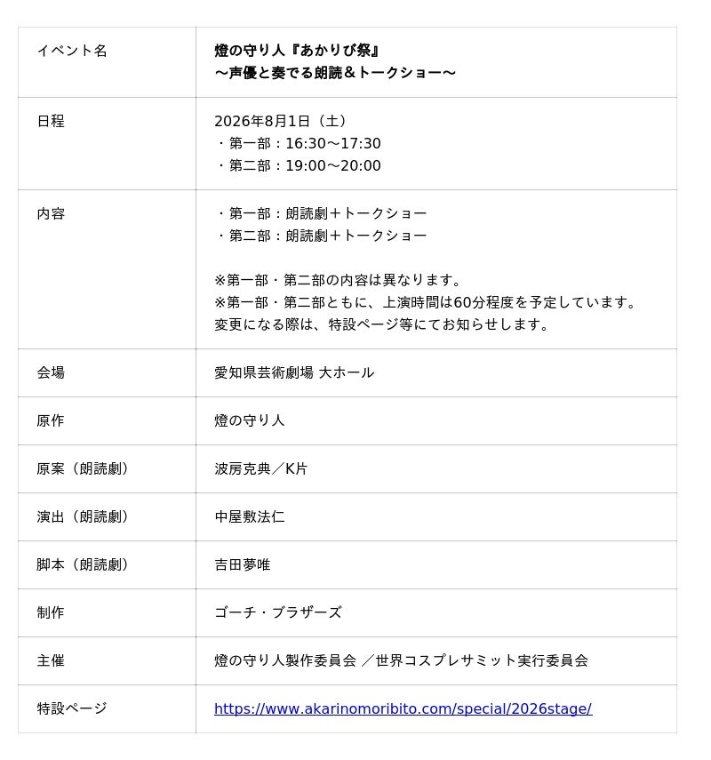 株式会社ワールドエッグス(本社:東京都港区、代表取締役社長:波房克典)と世界最大級のコスプレイベント「世界コスプレサミット」を主催する世界コスプレサミット実行委員会(本社:愛知県名古屋市、実行委員長:小栗徳丸)は、2026年8月1日(土)に愛知県芸術劇場 大ホールにて『あかりび祭』を開催することを決定いたしました。