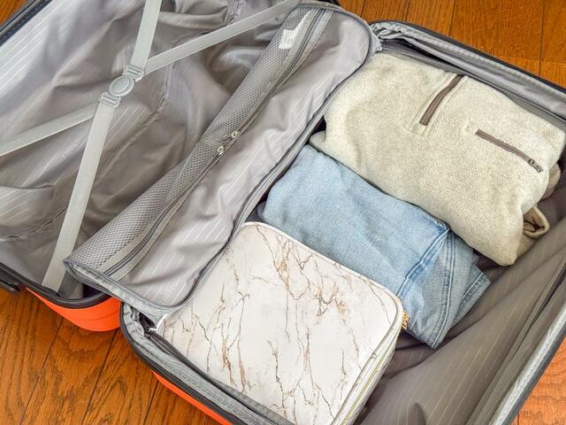 かさばるフリースやジーンズを入れて、化粧道具を入れてもまだまだスペースがあります。