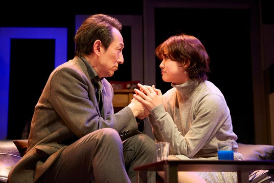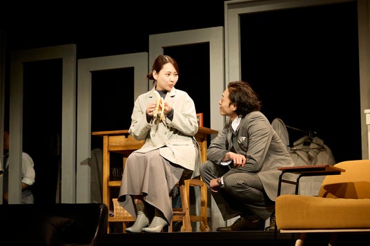 ホテルのバー、不動産会社のオフィス、アンブローズと父が暮らす家、ニコラの部屋、スチュワート兄妹が住む部屋、それらにスポットライトが当たると、それぞれの物語が進んでいく。観客は彼らの時間を次々とザッピングしながら観ているようで、自然に登場人物たちを身近に感じることができる。また、約2時間の上演中、キャストは皆、ほぼ舞台上にいる点もユニーク。演技巧者の面々によるマイクを通した声のみのシーンは、日替わりで楽しめそう。