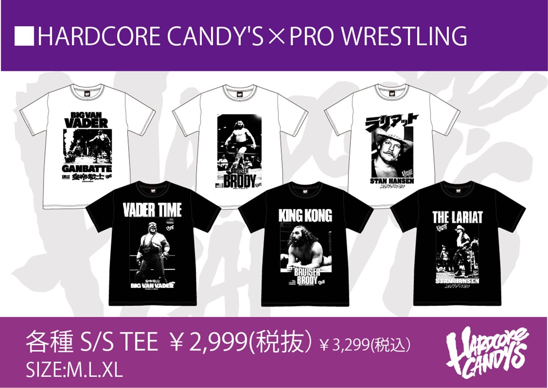 第一弾アイテムとして、ハードコアチョコレートの世界観を踏襲したオリジナルデザインに加え、レジェンドプロレスラーであるビッグバン・ベイダー、スタン・ハンセン、ブルーザー・ブロディをモチーフにしたデザインを展開いたします。