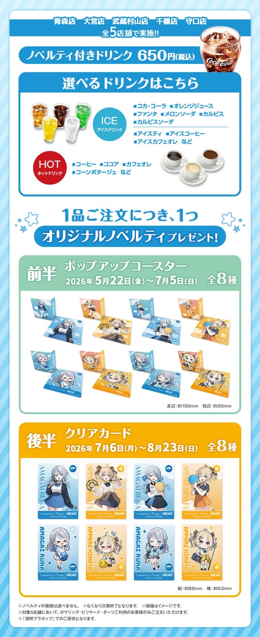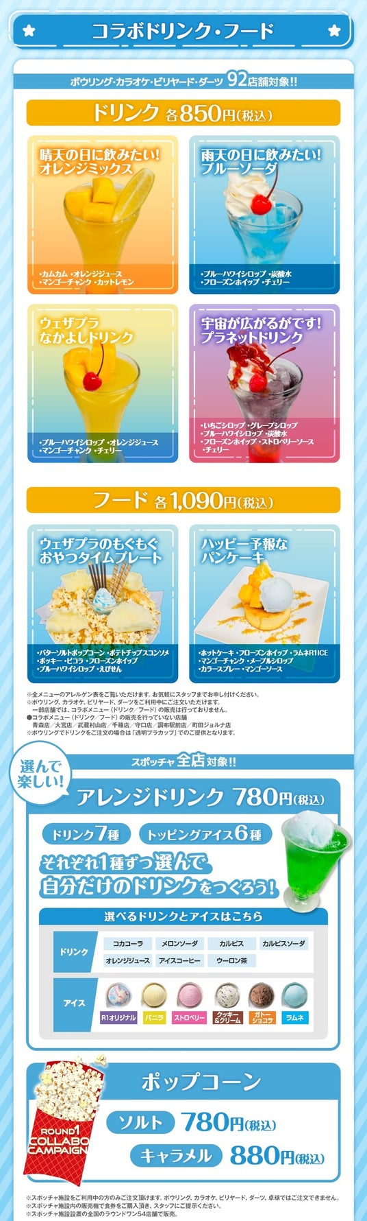 全国のROUND1内にあるボウリング93店舗・カラオケ93店舗・ダーツ71店舗・ビリヤード43店舗にて、コラボメニューを販売いたします。さらに、スポッチャ55店舗では、コラボポップコーンと、お好きなドリンクにアイスを自由にトッピングしてお楽しみいただけるアレンジドリンクもご提供いたします。いずれかの対象メニューをご注文いただいたお客様には、前半【ポップアップコースター(全8種)】、後半【クリアカード(全8種)】をランダムでプレゼントいたします。